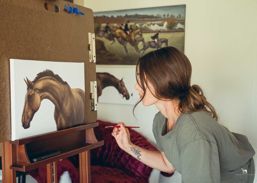 Art was one of those things that I always did. I was really good in school and learning always came really easily to me, so I frequently got bored. I was the kid that got in trouble for drawing horses all over their homework and school notes. With that, I actually went to college and got my degree in Pre-Veterinary Medicine, since science was and still is a huge passion of mine. However, when it came down to applying for vet schools, I realized my true passion was actually working with horses and so I became an assistant trainer. Long story short, in 2018, I was riding a very young colt and had a really bad fall that injured my spine. Though I’m fine now and fully healed, that fall made me reflect on the longevity of what I was doing. It inspired me to look into other careers that would allow me to ride and show my own horses, but not have my income dependent on it. That’s where the idea to start Ashley Tolton Art came from. My love for horses and equestrian sport (and those occasional vet bills) are what keep me motivated and in love with the job, every single day.